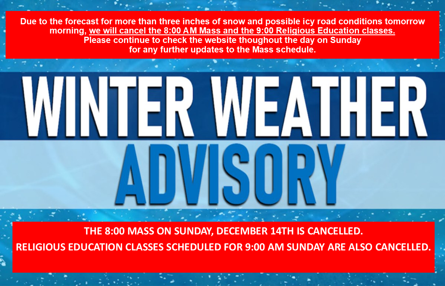 Parishioners are asked NOT to drive onto the parking lot until after 5:00 p.m. today, so we have time to clear and de-ice the parking lot and walkways.
